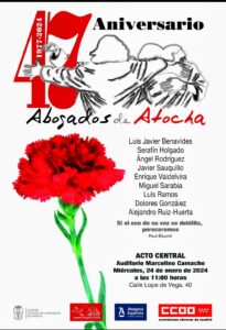 47 º Aniversario del asesinato de los Abogados de Atocha. El acto tendrá lugar en el Auditorio Marcelino Camacho el 24 de enero a partir de las 11:00 horas, en el que la Fundación Abogados de Atocha entrega sus premios y reconocimientos anuales.