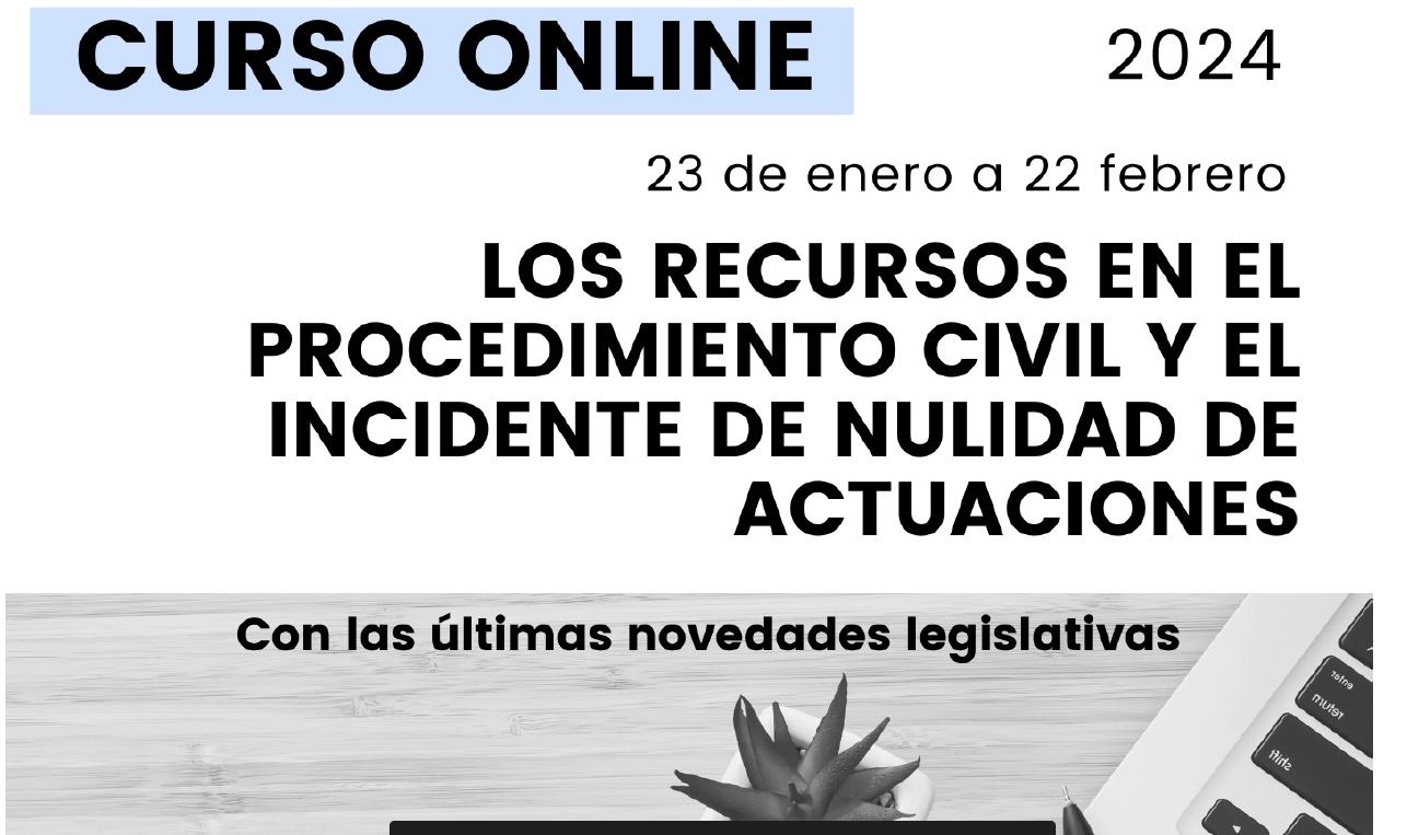 Curso online «Los recursos en el procedimiento civil y el incidente de nulidad de actuaciones» en el Colegio de la Abogacía de Murcia. Tendrá lugar del 23 de enero al 22 de febrero de 2024.