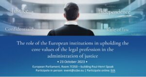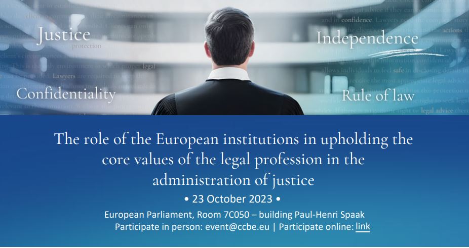 El Consejo de Abogados y Sociedades de Abogados de Europa (CCBE) organiza un evento de alto nivel organizado en el marco del Día Europeo del Abogado (DEL) el lunes 23 de octubre de 8.45 a 16.00 horas (CET), en el Parlamento Europeo, Bruselas.