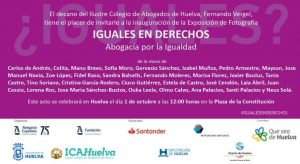 Inauguración de la Exposición “Iguales en Derechos. Abogacía por la Igualdad”, en la Plaza de la Constitución (Ayuntamiento de Huelva), organizada por la Fundación Abogacía Española y el Colegio de Abogados de Huelva. Se trata de una muestra de 30 fotografías de gran formato, cedidas por 15 fotógrafas y 15 fotógrafos de los más importantes de España, que son un Manifiesto por la Igualdad y una denuncia de la desigualdad.