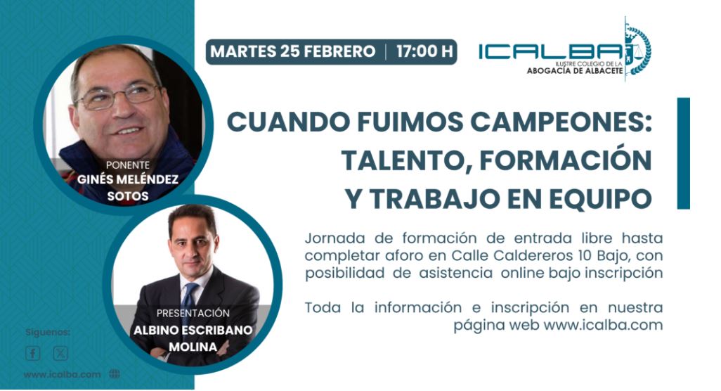 “Cuando fuimos campeones: Talento, Formación y Trabajo en Equipo”, nueva jornada formativa organizada por el Colegio de la Abogacía de Albacete, tendrá lugar el próximo martes 25 de febrero a las 17:00 horas.