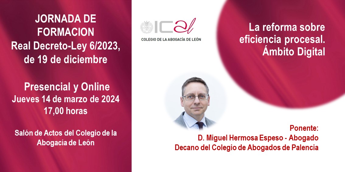 El próximo jueves 14 de marzo, a las 17h, se llevará a cabo la jornada de formación sobre el RDL 6/2023: «Reforma sobre eficiencia procesal en el ámbito digital», organizada por el Colegio de la Abogacía de León.