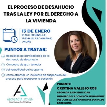 Contará con la participación de Cristina Vallejo Ros, abogada ejerciente del Colegio de la Abogacía de Barcelona y miembro de la Comisión Permanente del Consell de L’ Habitatge Social de Barcelona.