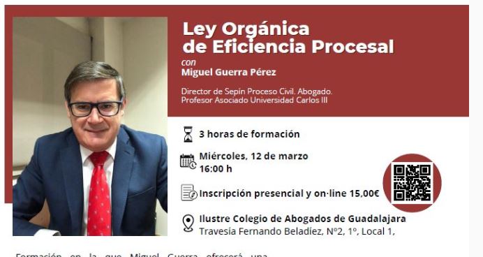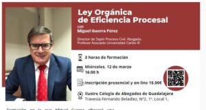 Jornada «Ley Orgánica de Eficiencia Procesal» en el Colegio de la Abogacía de Guadalajara. Contará con la colaboración de Miguel Guerra Pérez, abogado, profesor asociado de la Universidad Carlos III.