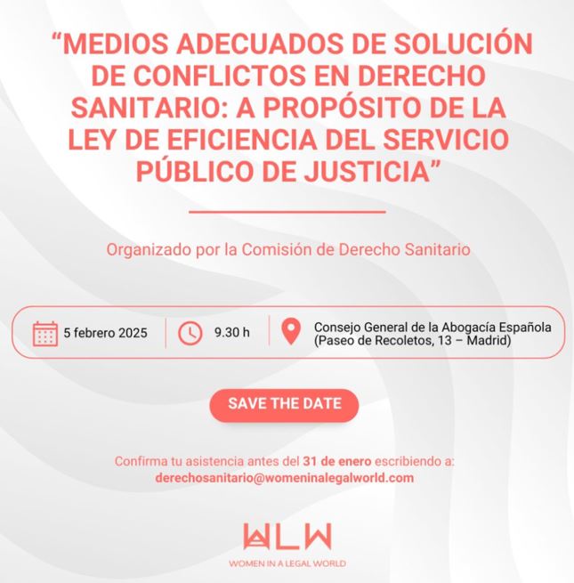 La jornada titulada “Medios adecuados de solución de conflictos en derecho sanitario: a propósito de la Ley de eficiencia del Servicio Público de Justicia” tendrá lugar el 5 de febrero de 2025 a las 9:30 horas en el Consejo General de la Abogacía Española (Paseo de Recoletos, 13 – 28004, Madrid).
