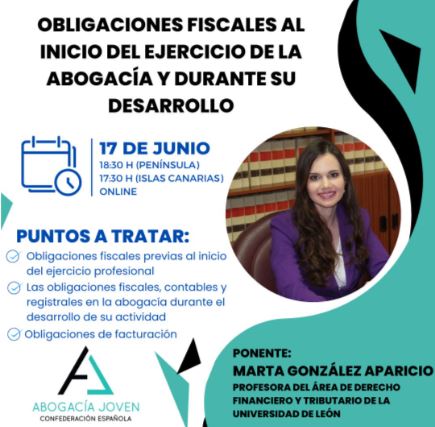 Jornada «Obligaciones fiscales al inicio del ejercicio de la abogacía y durante su desarrollo», organizada por la Confederación Española de la Abogacía Joven. A cargo de Marta González Aparicio, profesora del área de Derecho Financiero y Tributario de la Universidad de León.