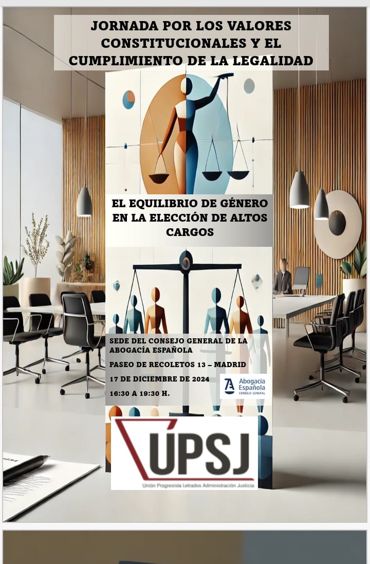 «Jornada por los valores constitucionales y el cumplimiento de la legalidad», organizado por la Unión Progresista de Letrados de la Administración de Justicia, en el Consejo General de la Abogacía Española. La inauguración correrá a cargo de Salvador González, presidente del Consejo General de la Abogacía Española.