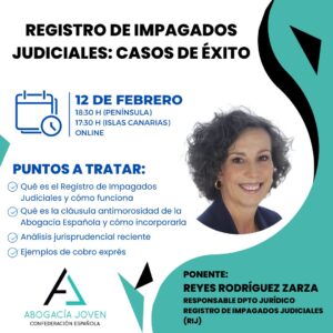 El próximo 12 de febrero, a las 18:30h, tendrá lugar una jornada sobre el nuevo sistema de notificación judicial de deudas del Registro de Impagados Judiciales, el fichero de morosos desarrollado por el Consejo General de la Abogacía Española con INFORMA, organizada por la Confederación Española de la Abogacía Joven.