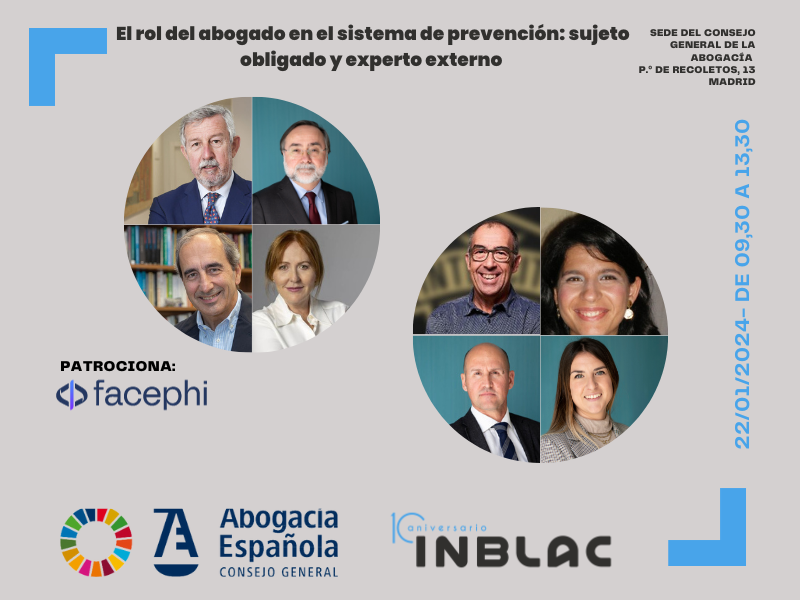 El Consejo General de la Abogacía Española analizará el próximo lunes 22 de enero “El rol del abogado en el sistema de prevención: sujeto obligado y experto externo”, en una jornada organizada por el Instituto de Expertos Externos en Prevención del Blanqueo de Capitales y Financiación del Terrorismo (INBLAC) y el Órgano de Prevención de Blanqueo de la Abogacía Española (OPBA).
