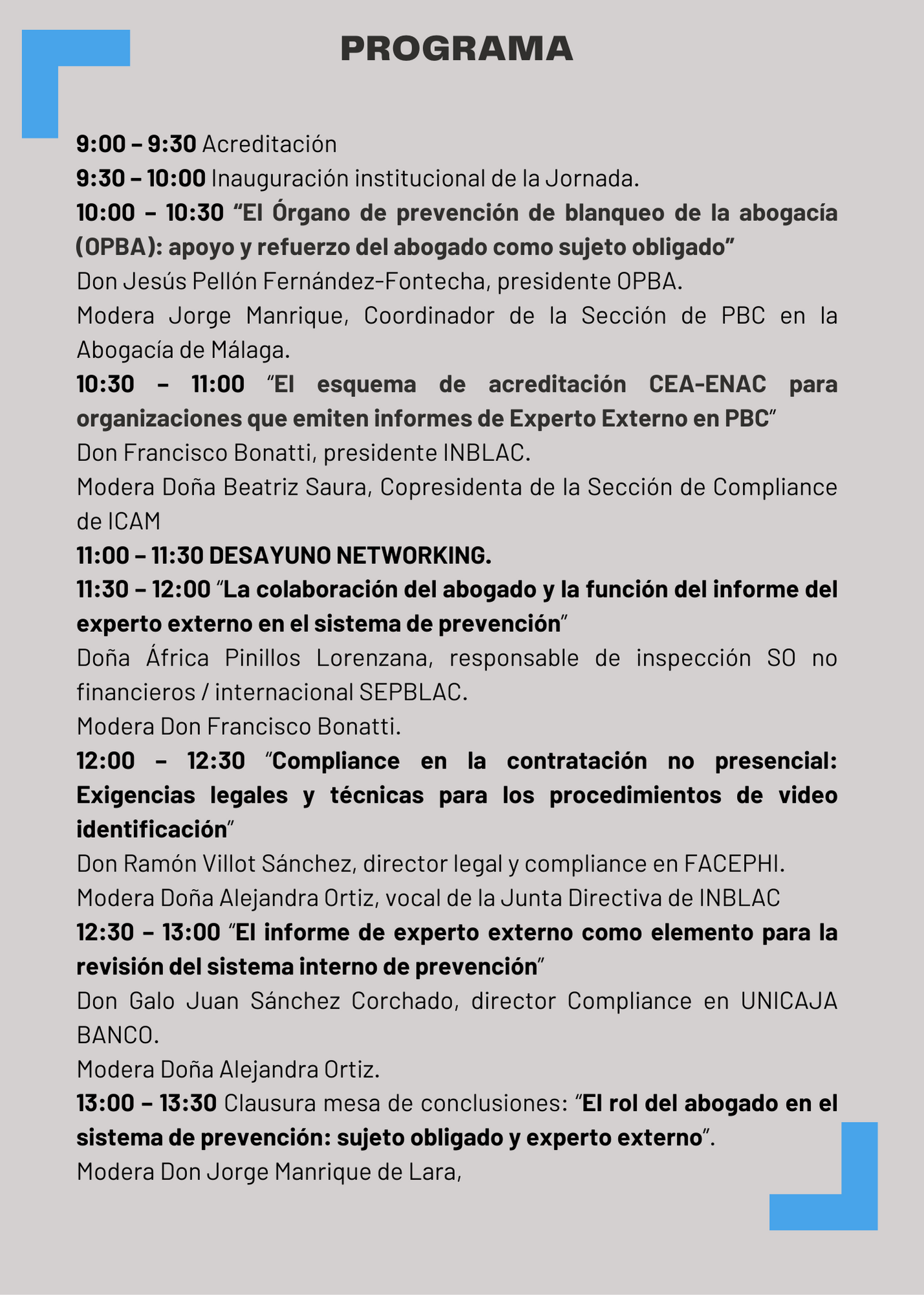 En la primera parte de la jornada se presentará “El Órgano de prevención de blanqueo de la abogacía (OPBA): apoyo y refuerzo del abogado como sujeto obligado” a cargo de Jesús Pellón Fernández-Fontecha, presidente del OPBA y Jorge Manrique, coordinador de la Sección de PBC en la Abogacía de Málaga.