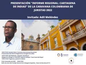 La presentación contara con la presencia de Adil Meléndez, abogado colombiano cuya situación de riesgo y amenazas recibidas está siendo controlada por el Observatorio Internacional de la Abogacía en Riesgo. Meléndez contará cuáles son los obstáculos a los que se enfrenta para poder ejercer su oficio con un especial enfoque en el caso “Canal del Dique”, por el que recibe amenazas desde que asumió la defensa de las comunidades campesinas afectadas.