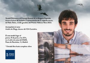 Presentación de La sospecha eterna, de Ediciones Versátil, en la sede del Consejo General de la Abogacía. Es la primera novela del escritor Pablo Alaña, por la cual ha recibido el Premio València Nova de narrativa en castellano en su edición de 2022, convocado por la Institució Alfons El Magnànim-Centre Valencià d’Estudis i d’Investigació.
