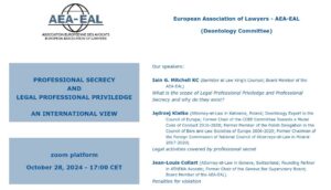 Webinar «Professional Secrecy and Legal Professional Priviledge. An International View”, organizado por el Comité de Deontología de la Asociación Europea de Abogados-AEA-EAL-, que tendrá lugar el próximo 28 de octubre, lunes, a las 17.00 horas CET.