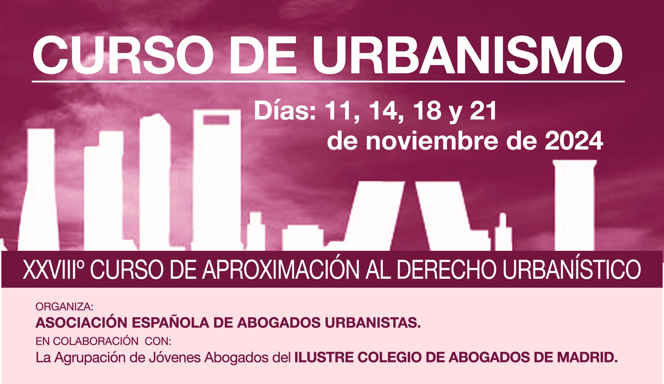 La Asociación Española de Abogados Urbanistas, en colaboración con la Agrupación de Jóvenes Abogados de Madrid (AJA), ha organizado el curso de Urbanismo que se celebrará en Madrid los días 11, 14, 18 y 21 de noviembre.