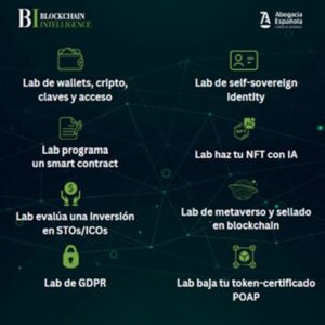 - Con profundidad jurídica y experiencia práctica en los Labs para desarrollar una experiencia crítica de acceso a Blockchain, uso de wallet, intercambio de criptomoneda, identidad digital soberana, programación de un Smart Contract, generación de NFTs, acceso a plataformas de inversión y certificación en Blockchain y entrada en nuestro Metaverso con descarga del token certificado de asistencia.