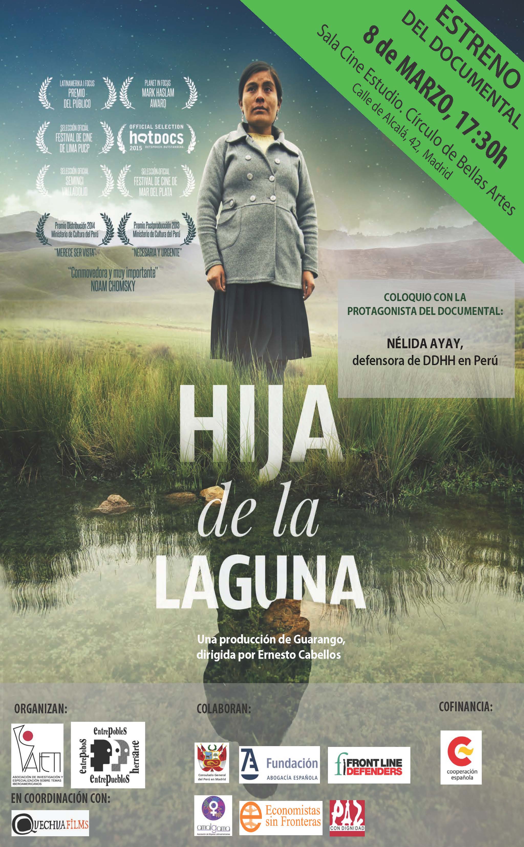 as ONGD AIETI y EntrePueblos, con el apoyo de los distribuidores, Quechua Films, invitan a la proyección del documental “Hija de la Laguna”, dirigido por Ernesto Cabellos Damián. La película se proyectará el 8 de marzo de 2016 a las 17.30 horas en la sala Cine Estudio del Círculo de Bellas Artes, de Madrid, y contará con la presencia de su protagonista Nélida Ayay Chilón, con quien se dará paso a un coloquio terminada la proyección. Con esta actividad, que cuenta con el apoyo de la Fundación del Consejo General de la Abogacía, se inicia la campaña “Derecho a defender derechos”, en el Día Internacional de la Mujer.