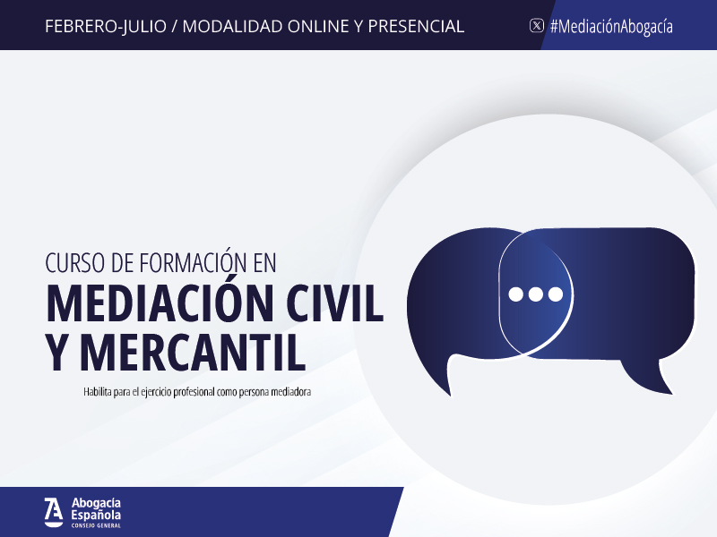 El Consejo General de la Abogacía Española ha abierto hoy la inscripción para la tercera edición del curso de formación en Mediación Civil y Mercantil, que se desarrollará, en formato presencial y online, desde el 10 de febrero hasta el mes de julio.