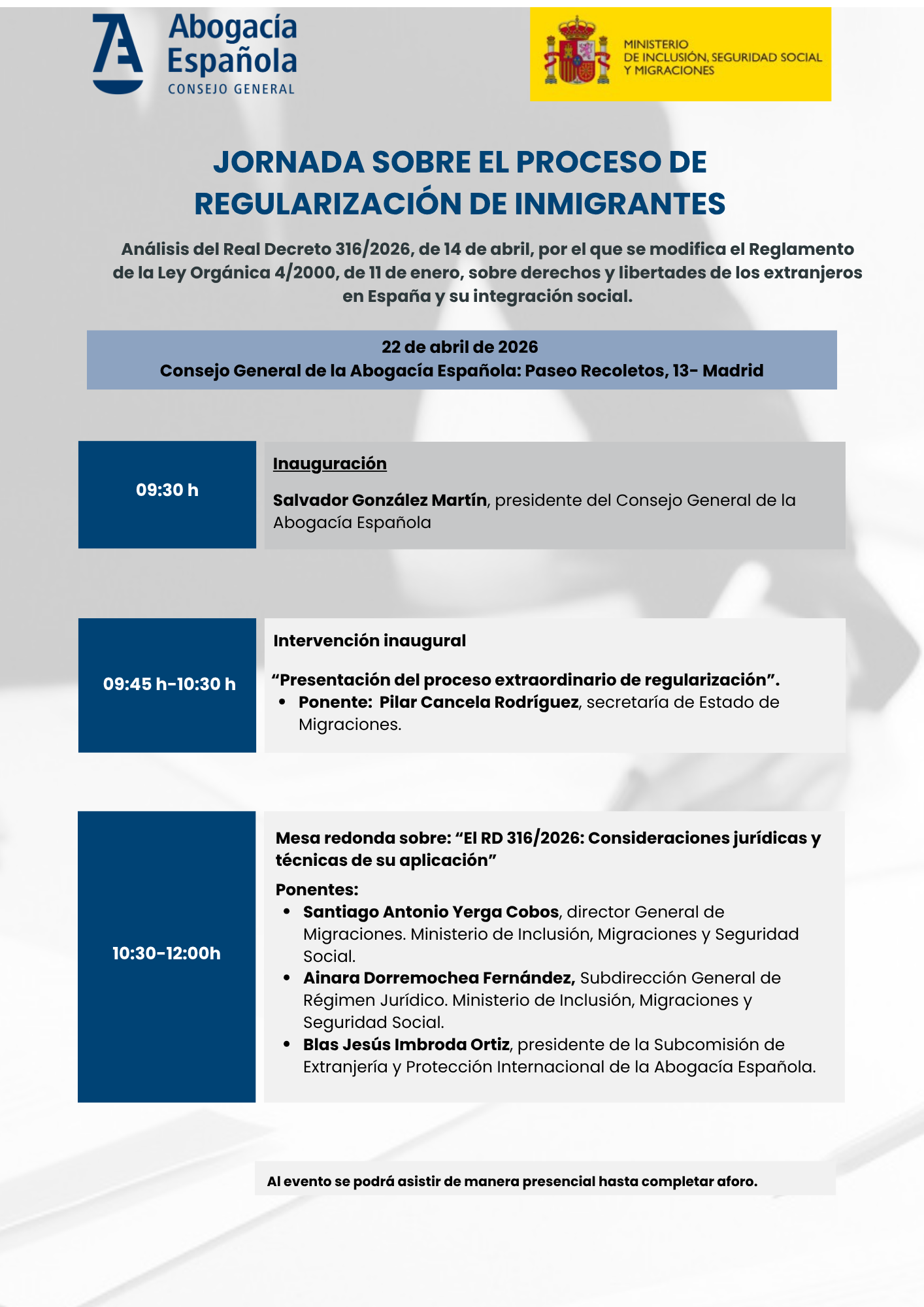 Participará Salvador González, presidente de la Abogacía Española. Durante la jornada, se abordarán los detalles del proceso extraordinario de regularización por parte de Pilar Cancela, secretaria de Estado de Migraciones.