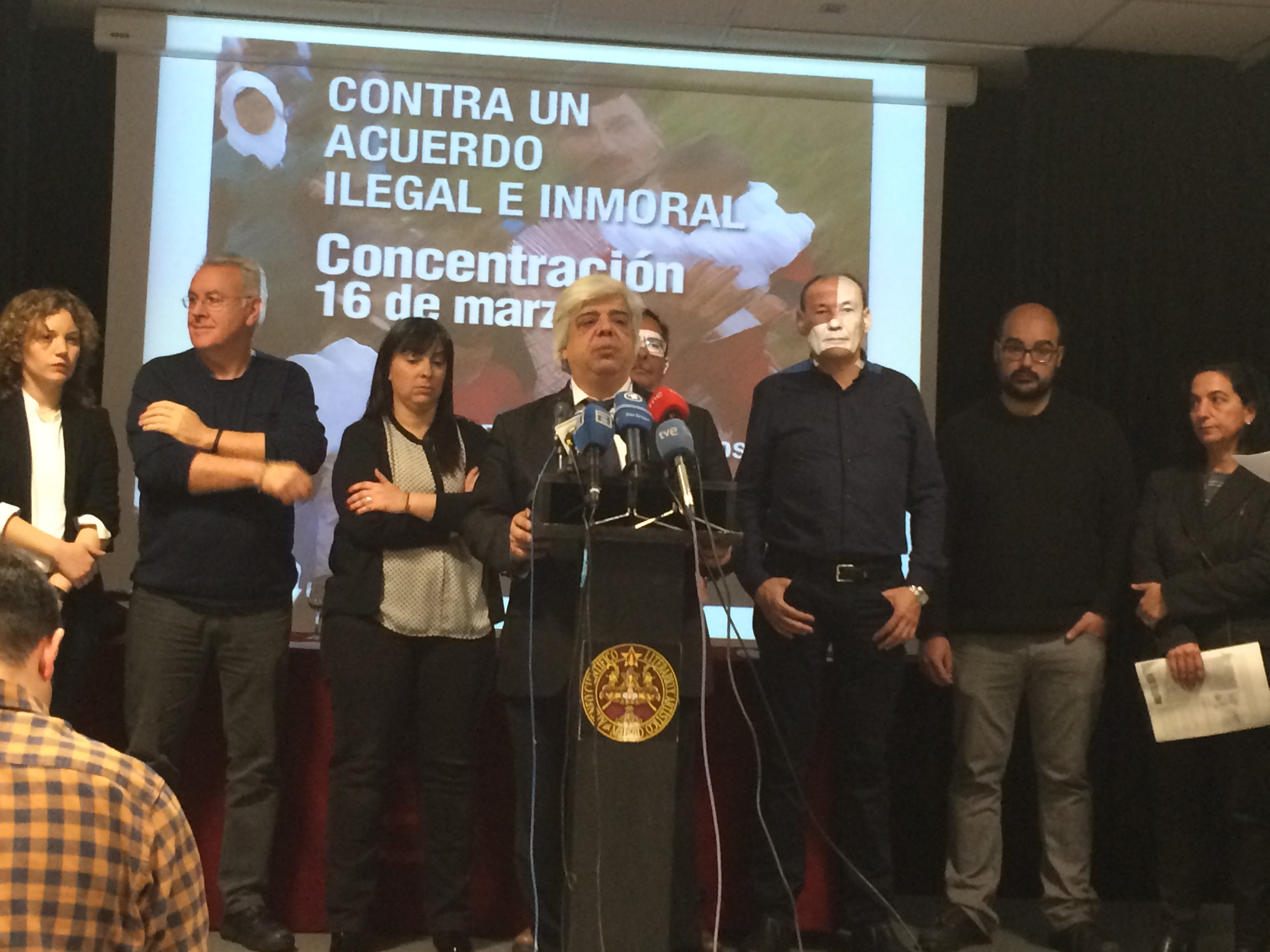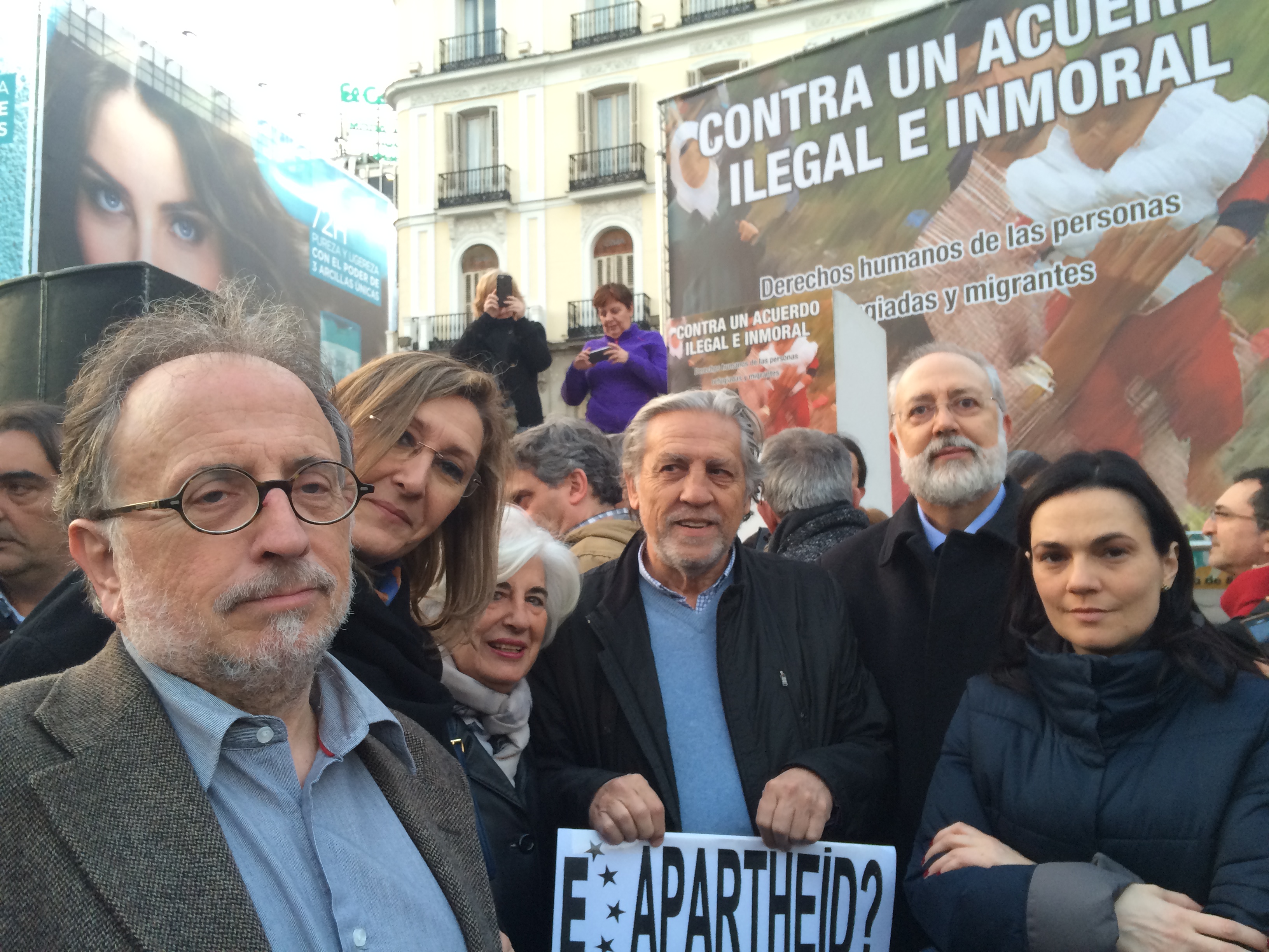 Por la tarde, Carles McCragh y los también consejeros Sonia Gumpert, decana de Madrid; Vicente Pascual, decano de Elche y Carmen Pérez Andujar, secretaria de la Junta de Gobierno del Colegio de Abogados de Madrid, asistieron a la concentración convocada en la Puerta del Sol de Madrid por partidos políticos y organizaciones sindicales y sociales contra un preacuerdo «ilegal e inmoral que atenta contra los derechos humanos y el derecho de asilo».