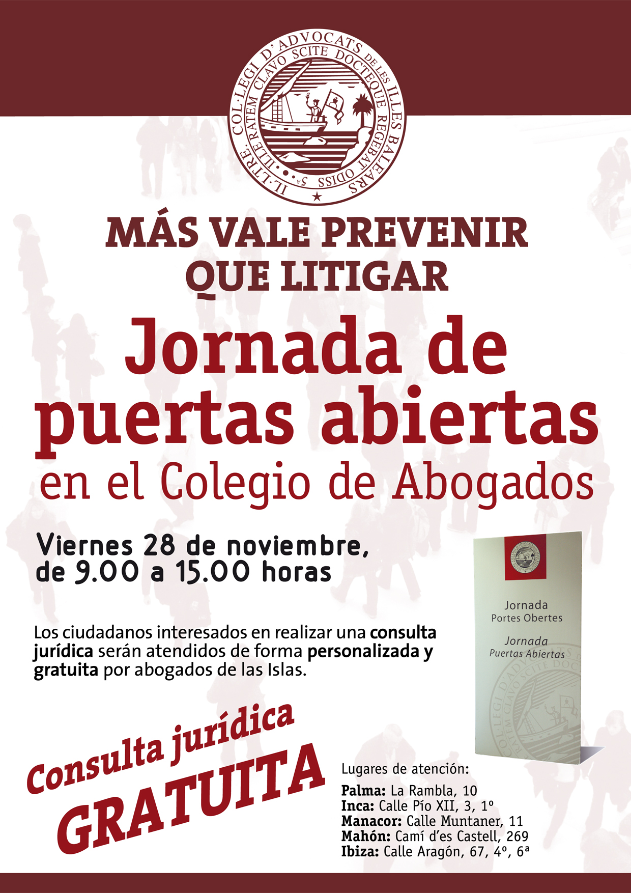 Ayudar a los ciudadanos a resolver sus dudas legales, promover la prevención jurídica y la importancia de la consulta previa a los profesionales de la abogacía, y acercar la figura del abogado a la sociedad es el triple objetivo de la nueva edición de la Jornada de Puertas Abiertas que organiza el Colegio de Abogados de Baleares y que tendrá lugar el próximo viernes, día 28 de noviembre, de las 9 a las 15 horas.