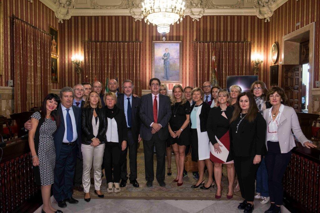 Los abogados y jueces italianos, encabezados por el presidente de la cámara civil Diego Casonato y la letrada Mar Moya, que visitan el Colegio de Abogados de Sevilla también han visitado el Ayuntamiento de Sevilla donde han sido cumplimentados por la delegada de relaciones institucionales Carmen Castreño.