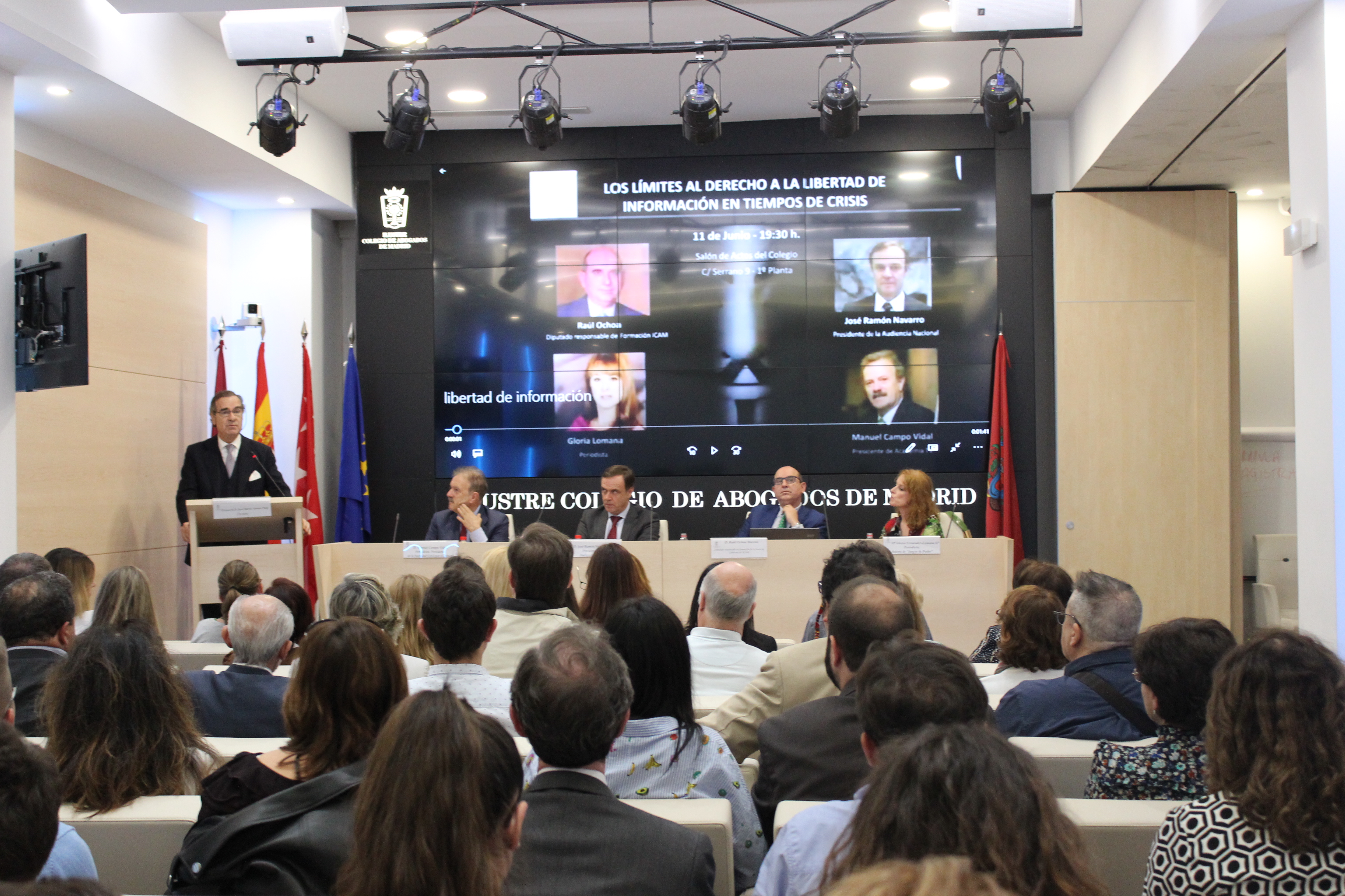El Aula de Debate del ICAM celebró anoche su quinta jornada, consolidándose como punto de encuentro de los operadores más importantes del sector jurídico y de la sociedad civil. En esta ocasión, el tema abordado fue “El derecho a la libertad de información en tiempos de crisis”, con un cartel formado por el presidente de la Audiencia Nacional, José Ramón Navarro Miranda; el periodista y presidente de Sociedad Civil por el Debate, Manuel Campo Vidal; la escritora Gloria Lomana; y la acostumbrada intervención del diputado responsable de Formación del Colegio, Raúl Ochoa, como moderador.