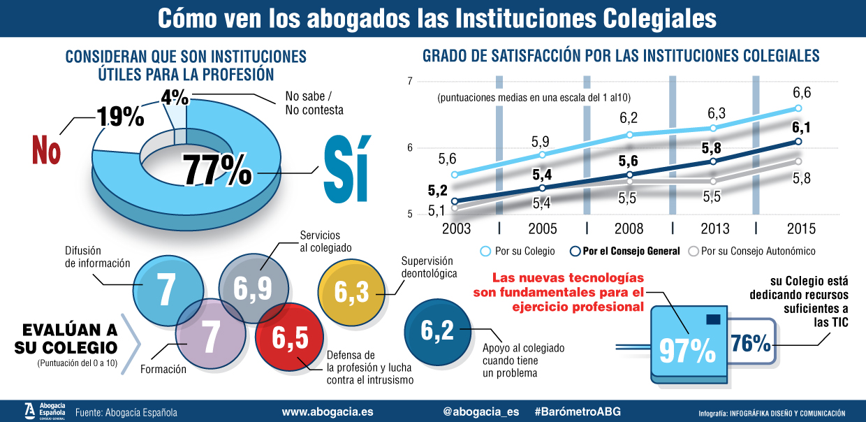 El grado de satisfacción global con el funcionamiento de la organización colegial sigue creciendo. El Consejo General de la Abogacía Española mejora de forma importante en la puntuación obtenida por los abogados con una nota de 6.1 frente al 5.1 alcanzada en 2003. Por su parte, los colegiados evalúan con una puntuación media de 6.6 a los Colegios, un punto más que en 2003 y a los Consejos Autonómicos con 5.8 puntos frente a los 5.1 de 2003.