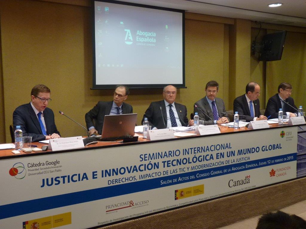 Carnicer hizo estas declaraciones el jueves 12 de febrero durante la inauguración del Seminario ‘Justicia e innovación tecnológica en un mundo global’, organizado por la Universidad San Pablo CEU y la Cátedra Google. La presentación e inauguración del evento formativo contó con la presencia, además del presidente de la Abogacía y del ministro de Justicia, con el embajador de Canadá en España, Jon Allen, el vicerrector de Relaciones Internacionales de la Universidad CEU y titular de la cátedra Google sobre Privacidad, Sociedad e Información, José Luis Piñar, y el director de Políticas y Asuntos Públicos de Google España y Portugal, Francisco Ruiz.