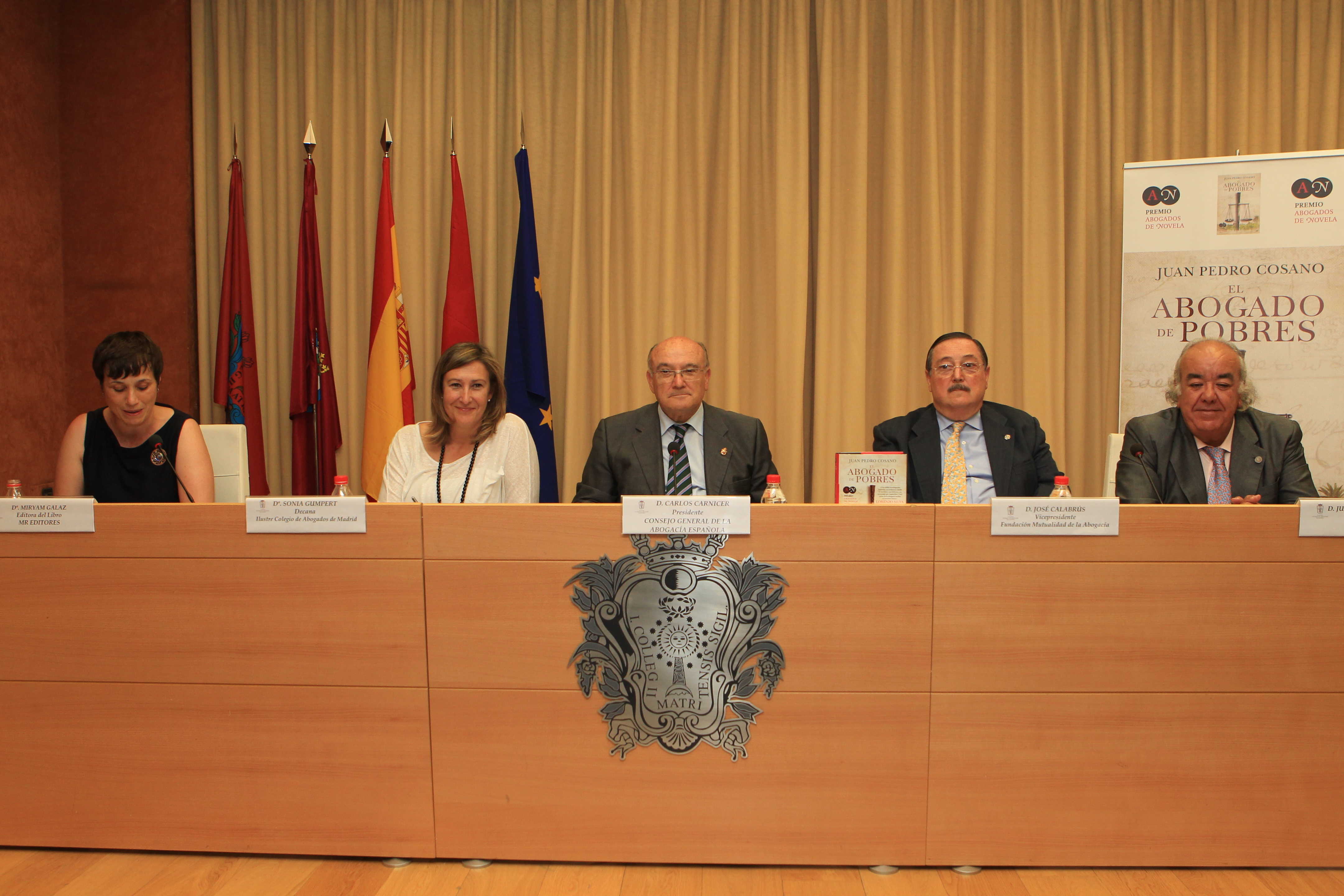 El presidente del Consejo General de la Abogacía, Carlos Carnicer, y la decama del Colegio de Abogados de Madrid (ICAM), Sonia Gumpert presentaron ayer en la sede de la Abogacía madrileña El abogado de pobres, ganadora del premio Abogados de Novela, cuyo autor, el abogado jerezano Juan Pedro Cosano, participó también en el acto. Junto a ellos estaban también Miriam Galaz, de MR Ediciones, editora de la novela, y José Calabrús, vocal de la Mutualidad de la Abogacía, patrocinadora del premio junto al Consejo General de la Abogacía.