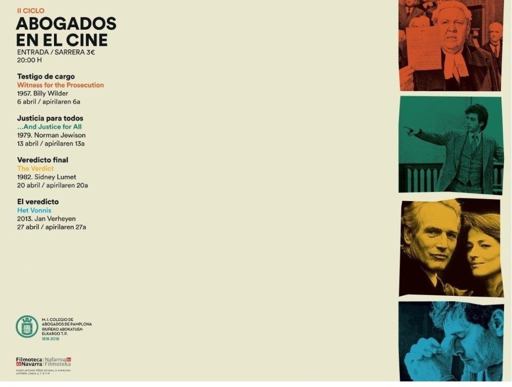 El viernes día 6 de abril mes de abril comenzará en la Filmoteca de Navarra el segundo ciclo de Abogados en el Cine, programado dentro de las actividades de celebración del 200 aniversario del nacimiento del Colegio de Abogados de Pamplona.El primer ciclo se organizó en Septiembre de 2017 en colaboración con la Filmoteca, y consistió en la proyección de cuatro interesantes películas. Esta iniciativa, avalada por la calidad de las cintas, tuvo un notable éxito de público.