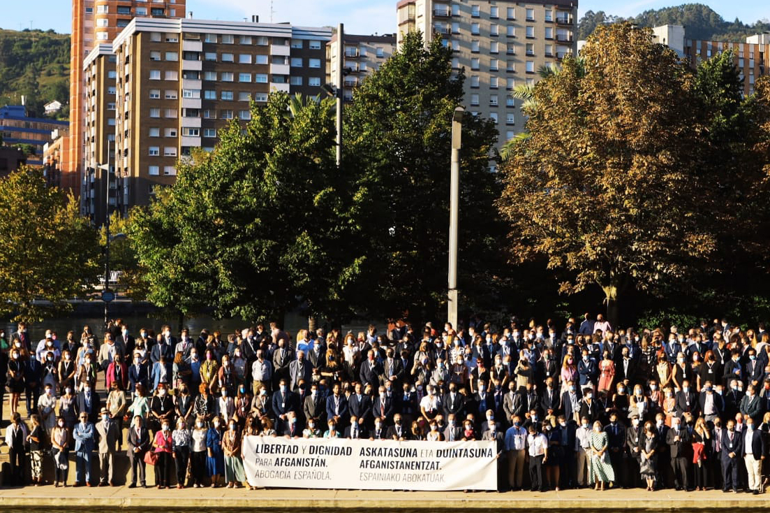 En el acto, que se ha realizado en Bilbao frente al Palacio Euskalduna antes del inicio de las VIII Jornadas de las Juntas de Gobierno, ha estado presente el ex fiscal general de Afganistán, Zabihuláh Karimullah, evacuado con su familia a finales de agosto por militares españoles.