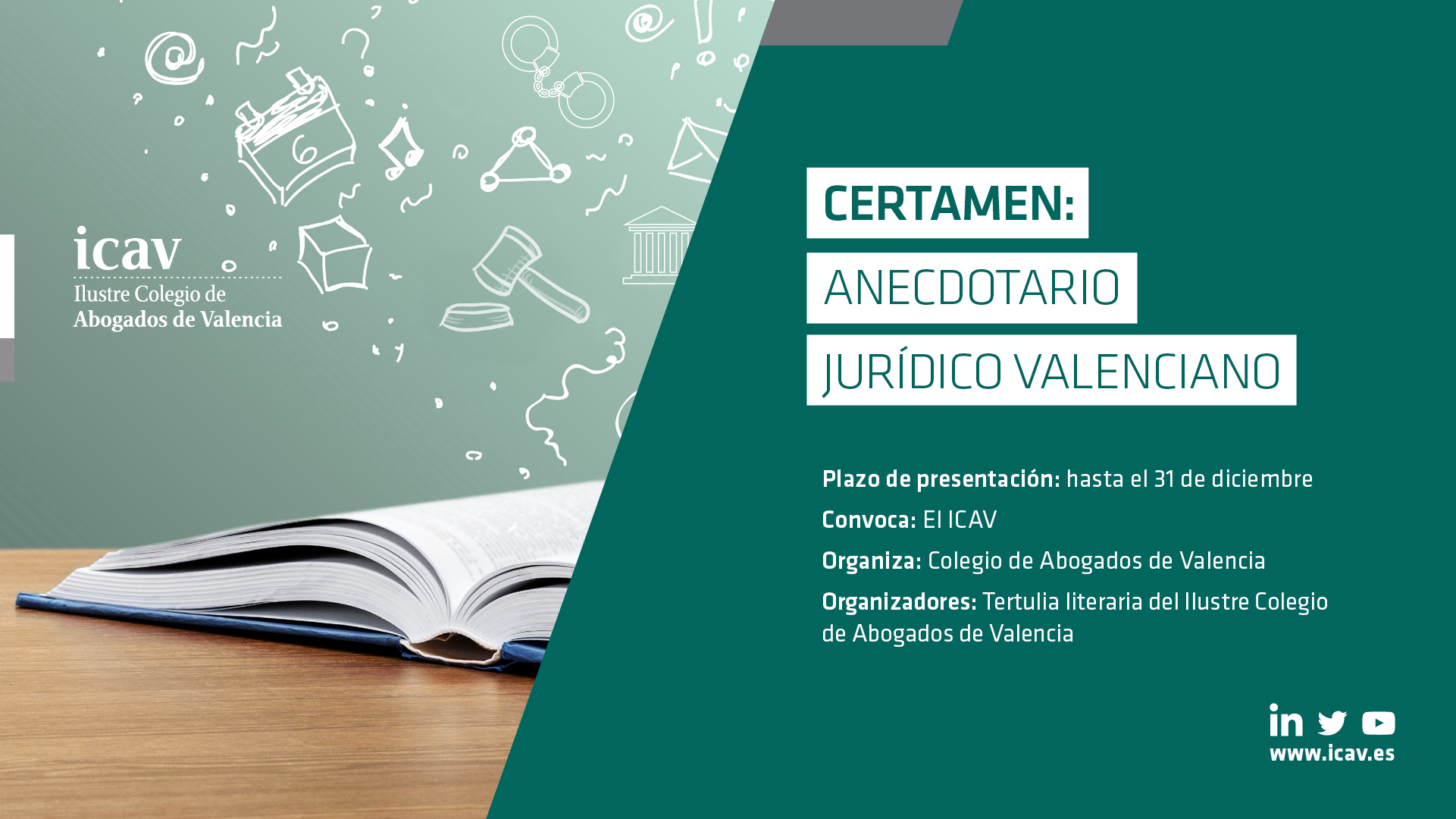 Como parte de los actos previstos para conmemorar el 260 aniversario de su nacimiento, el ICAV ha puesto en marcha el, que en esta edición se presenta bajo el título “Anecdotario Jurídico Valenciano del Ilustre Colegio de Abogados de Valencia”. Una acción cultural dirigida a los profesionales jurídicos, así como a la ciudadanía, cuyo primer premio está dotado con un diploma acreditativo y una dotación económica de 2.000 euros en metálico.