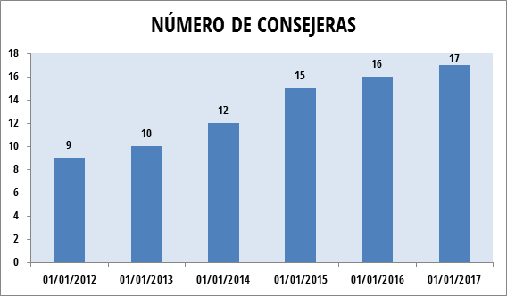 Esta cifra ha ido aumentando lentamente en los últimos cinco años. Así, se ha pasado de 9 consejeras en 2012 a las 17 actuales. En 2013 había 10 consejeras, que aumentaron a 12 en 2014, 15 en 2015 y 16 en 2016.