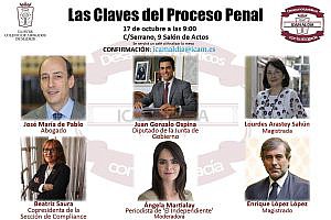 Bajo la coordinación del diputado responsable de Comunicación del ICAM, Juan Gonzalo Ospina, se abordarán“Las claves del proceso penal”, en el primer desayuno jurídico organizado. Los magistrados Enrique López y Lourdes Arastey, la copresidenta de la Sección de Compliance del ICAM, Beatriz Saura, y el abogado penalista José María de Pablo, participarán en una mesa redonda que moderará la periodista de El Independiente Ángela Marialay.
