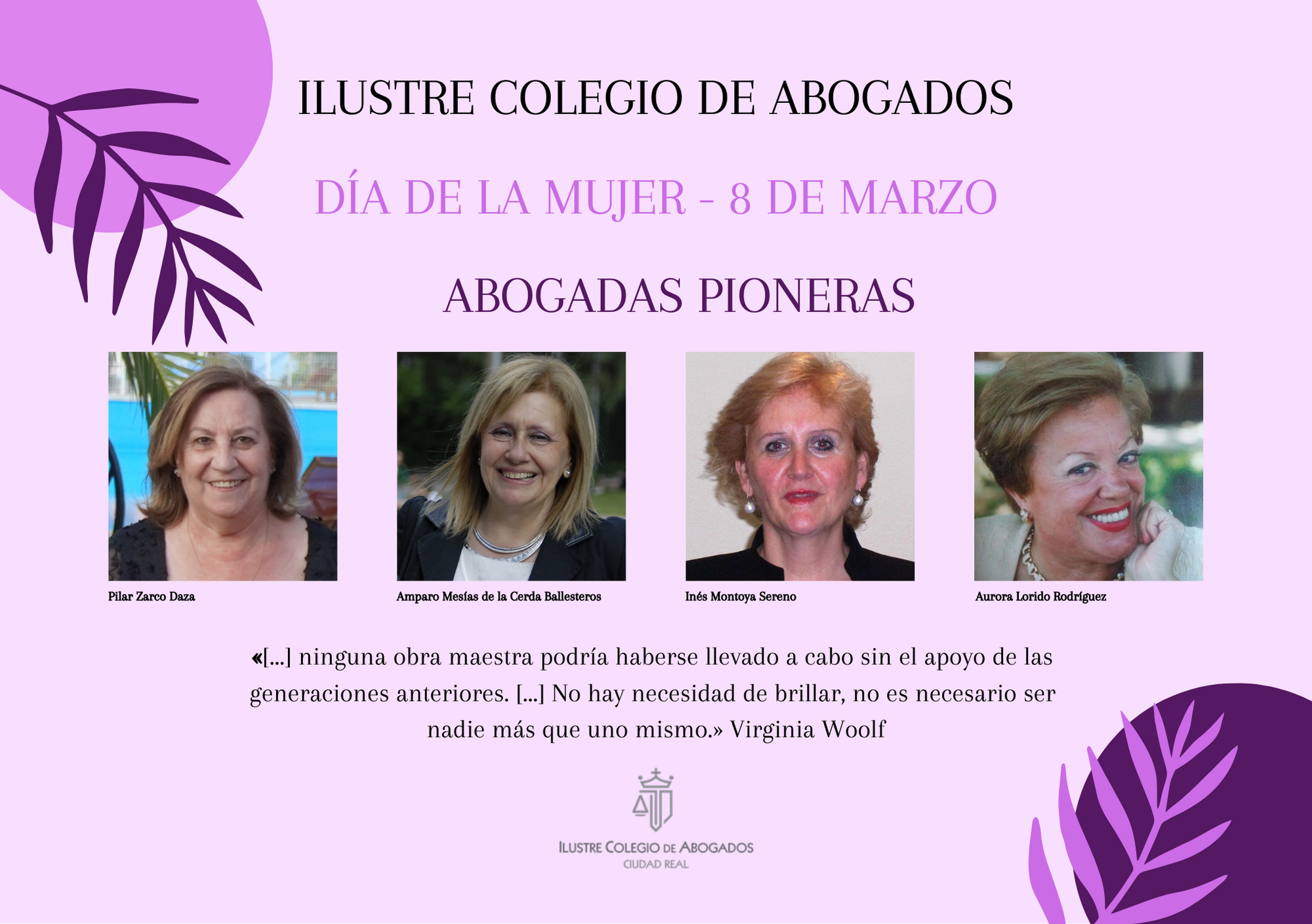 El Colegio de Abogados de Ciudad Real, con motivo de la celebración del Día Internacional de la Mujer, ha acordado otorgar la distinción de «Abogadas pioneras» a las primeras mujeres de la provincia que tuvieron la valentía de colegiarse y ser abogadas en un mundo casi exclusivo de hombres.