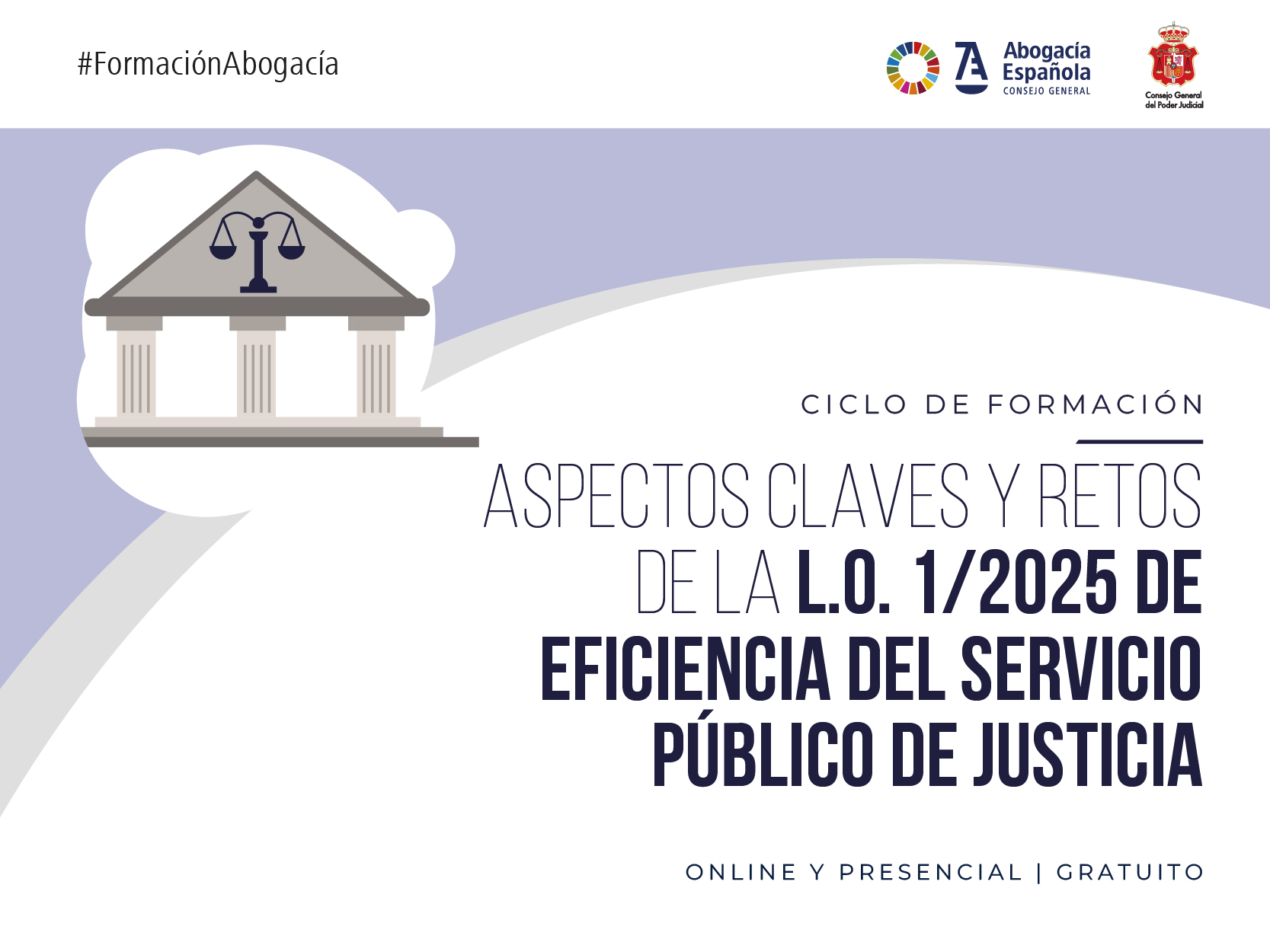 El próximo 25 de febrero dará comienzo el ciclo formativo organizado por la Abogacía y el Consejo General del Poder Judicial para que los profesionales de la abogacía conozcan en profundidad las modificaciones introducidas por la Ley Orgánica 1/2025 en materia de eficiencia del Servicio Público de Justicia.