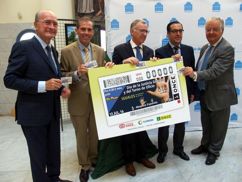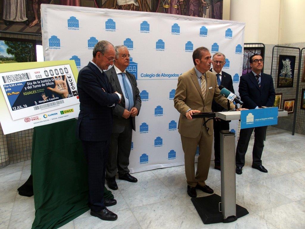 A continuación, el decano del Colegio de Abogados y el director de la ONCE en Málaga, José Miguel Luque, han presentado el cupón conmemorativo del Día del Justicia Gratuita y el Turno de Oficio, que se comercializará el próximo 12 de julio en toda España.