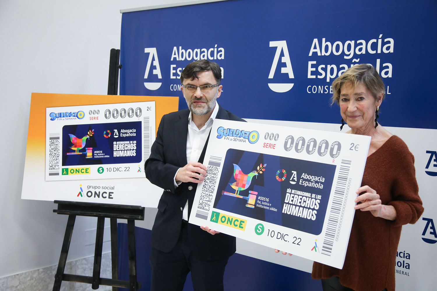 Victoria Ortega, presidenta del Consejo General de la Abogacía Española, y Alberto Durán, vicepresidente primero de la ONCE, han presentado hoy el cupón del sorteo de la ONCE del sábado 10 de diciembre, dedicado al Día Internacional de los Derechos Humanos que se conmemora esa fecha.