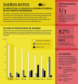 La crisis económica en España, donde hay más de 5 millones de desempleados, golpeó especialmente duro a los propietarios de vivienda. España tiene uno de los niveles de propiedad de vivienda más altos de la Unión Europea –alcanza el 85 por ciento— y apenas el 2 por ciento de la oferta total de vivienda está reservada para la vivienda pública o de alquiler subsidiado. La recesión azotó a España después de un auge en la construcción que duró de 1997 a 2007, período durante el cual se construyeron más viviendas en España que en Francia, Alemania y el Reino Unido juntos, y en el que el sector inmobiliario y de la construcción constituía hasta el 43 por ciento del Producto Interno Bruto del país.