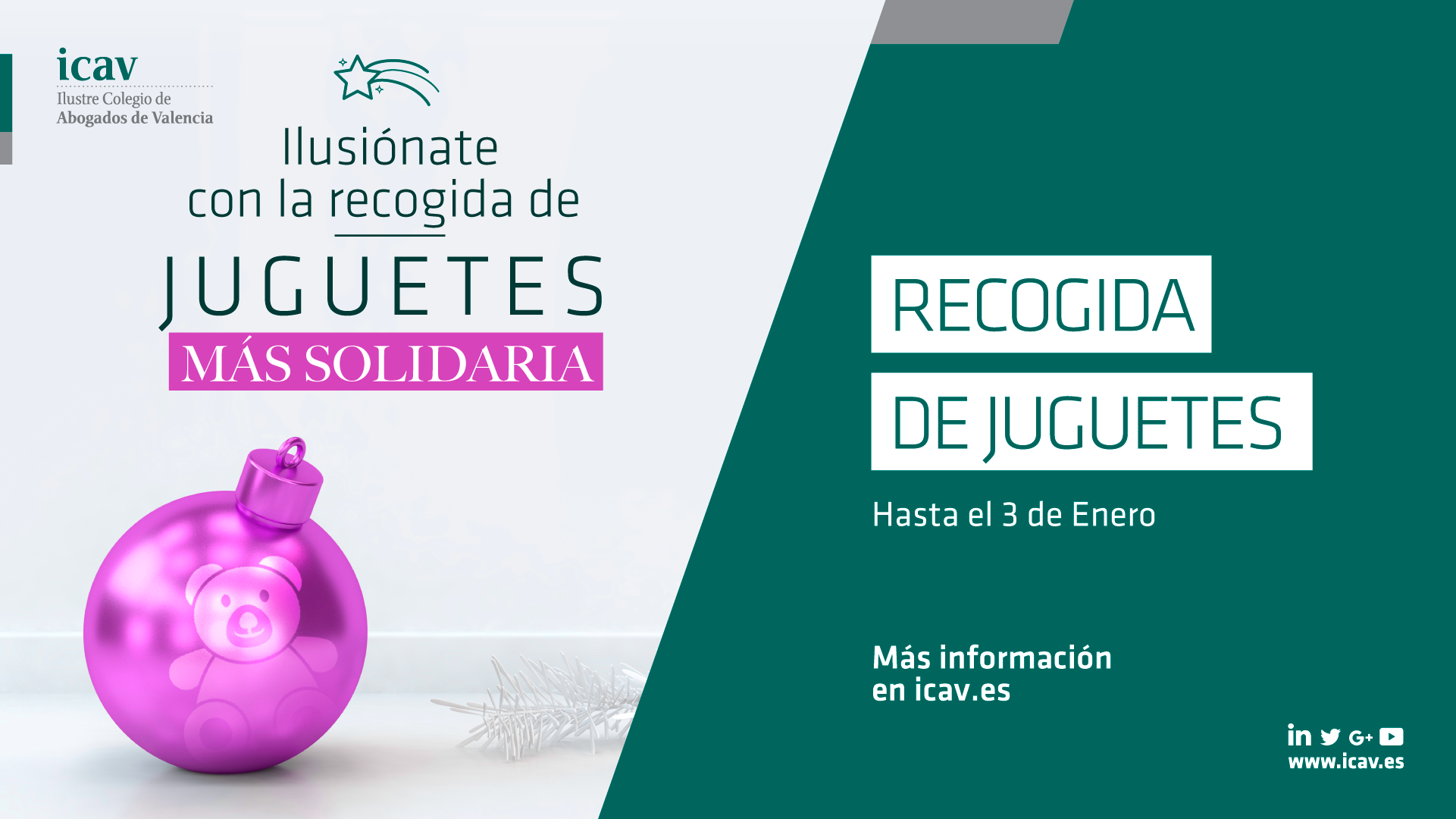 Como cada año cuando se acercan las fechas navideñas, el Colegio de Abogados de Valencia celebra su “CAMPAÑA DE RECOGIDA DE JUGUETES Y LIBROS” en beneficio de los niños y niñas más desfavorecidos. Una iniciativa enmarcada dentro de las actividades solidarias que el ICAV desarrolla como parte de su Responsabilidad Social, y que se lleva a cabo, junto con la Sección de Derecho del Menor. Las donaciones se recibirán en el hall del Colegio hasta el próximo 2 de enero de 2019.