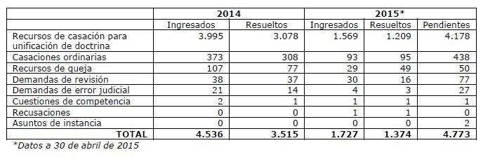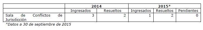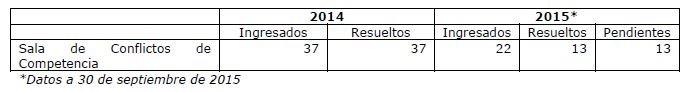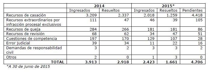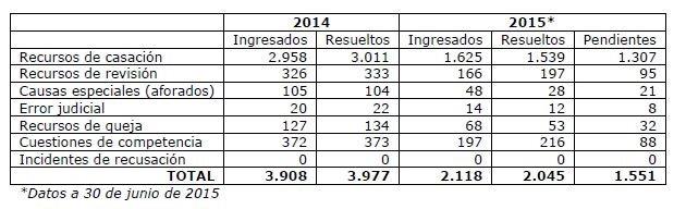 La proyección anual de ingreso de asuntos en 2015 (4.442) supera de forma considerable la de 2014 (3.913) y pese a que la proyección de asuntos resueltos (3.045) es superior a la del año anterior (2.918), el nivel resolutivo es inferior a la entrada, por lo que se propone valorar la posibilidad de ampliar la planta de la Sala en dos magistrados.