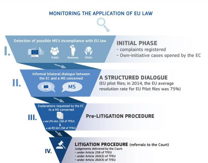 Detección de una posible infracción por parte de un Estado Miembro (EM) de la legislación vigente en la Unión Europea. La denuncia pueden formularla: CE, UE, público, empresas, ONGs