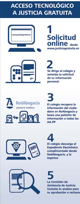 El Expediente Electrónico de Justicia Gratuita permite recopilar de forma automática gran parte de los documentos necesarios para justificar la solicitud del derecho a la Justicia Gratuita. Cerca de 70 Colegios de Abogados disponen de este servicio y están conectados de forma telemática y segura con instituciones como la Agencia Tributaria, el Instituto Nacional de la Seguridad Social y su Tesorería General, la Dirección General del Catastro o el Servicio Público de Empleo Estatal, entre otras