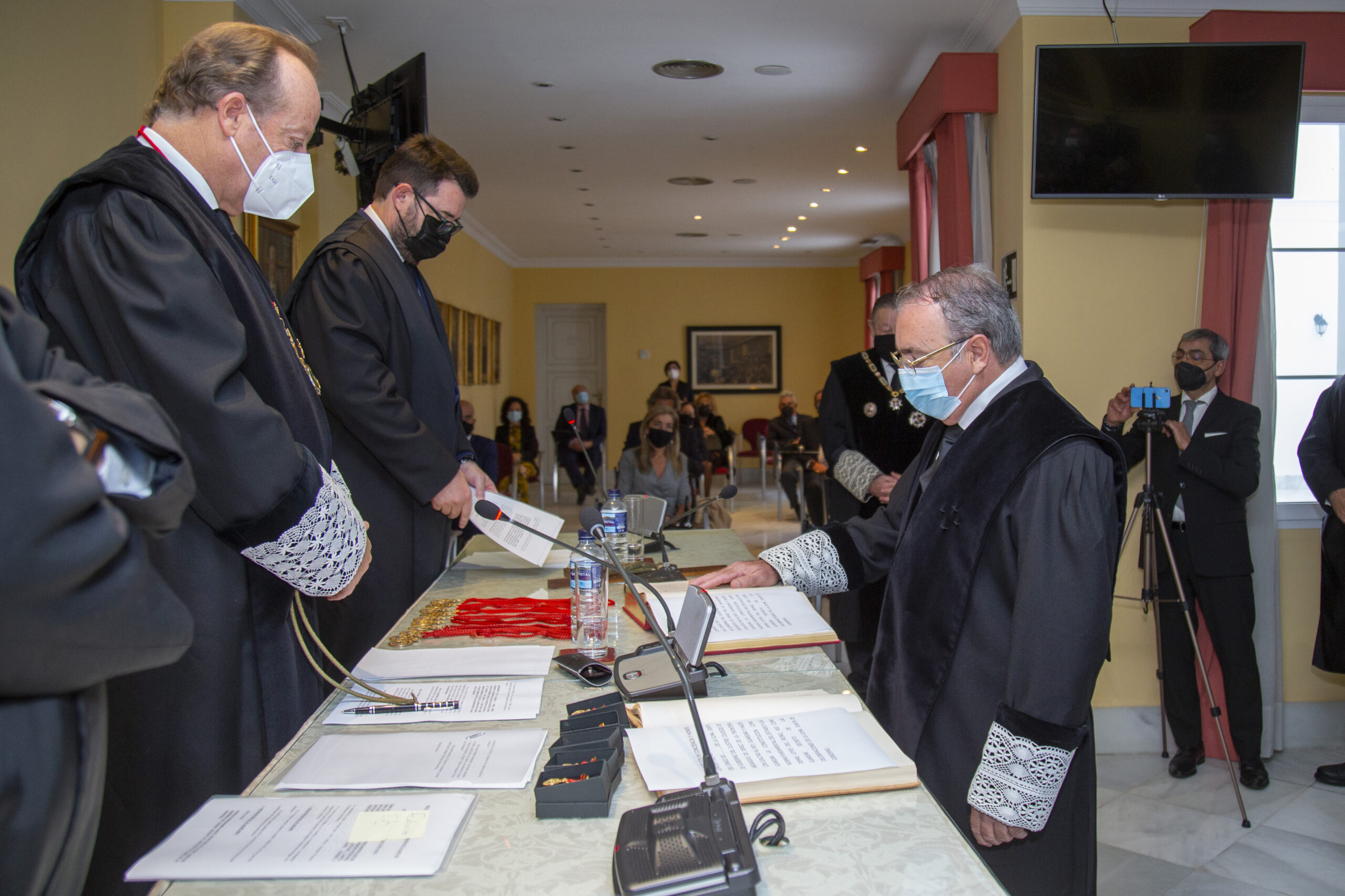 Tras estas palabras, se procedió a la jura del cargo de decano de Federico Fernández, a quien Marcos Camacho le impuso la medalla colegial desde el estrado, bajando posteriormente, para colocarle el escudo de decano en la toga.