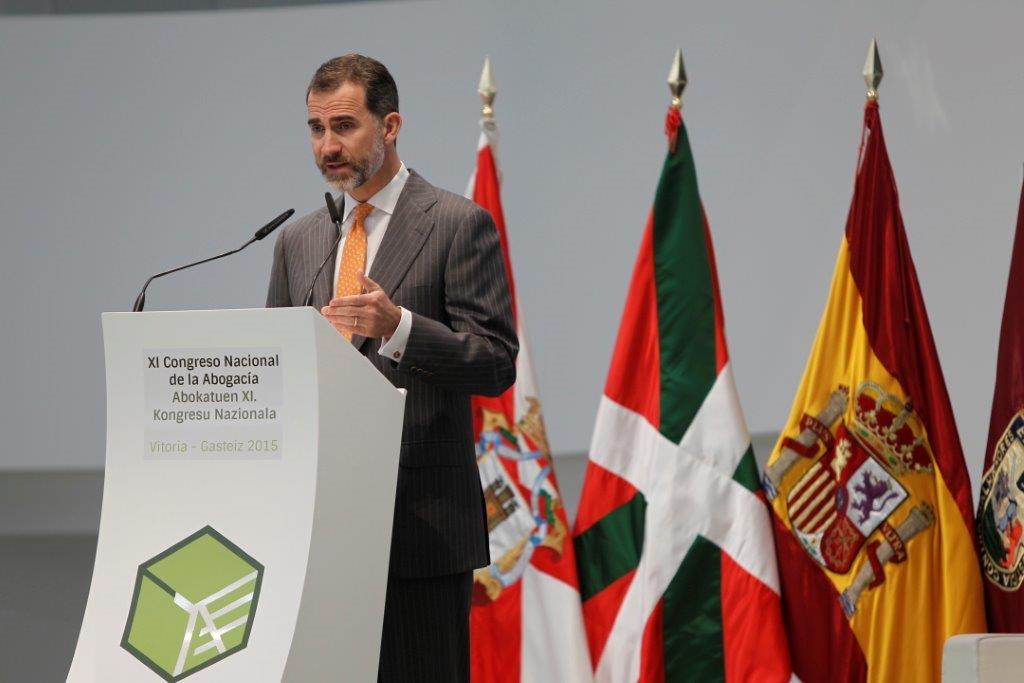 Sé que es todo un acontecimiento reunir al conjunto de los abogados de España, históricamente algo no muy frecuente —¡once ediciones en un siglo!—, aunque últimamente ya se celebra cada cuatro años. Por ello, y porque la Abogacía es, ante todo, un referente inmediato para los ciudadanos en todo lo relacionado con la Justicia, la Ley y el Derecho, me alegra poder acompañaros hoy en este acto inaugural para daros todo mi apoyo. Y, por supuesto, me alegra que hacerlo me traiga a Vitoria, a esta querida capital del País Vasco, por primera vez en este —todavía— primer año de reinado.
