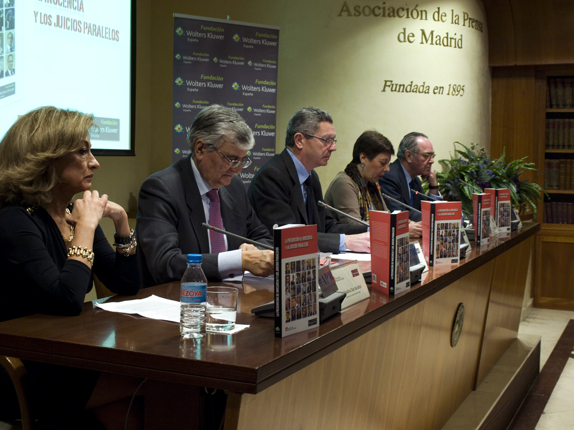La Fundación Fernando Pombo y la Fundación Wolters Kluwer presentaron el lunes 18 de febrero en la Asociación de la Prensa de Madrid el libro titulado ‘La presunción de inocencia y los juicios paralelos’, una obra colectiva enfocada a analizar un fenómeno creciente en los medios de comunicación y redes sociales que entorpece la acción de la Justicia y que afecta de modo especialmente grave a las partes implicadas en el proceso. La obra, coordinada por la especialista en Derecho Constitucional Ana María Ovejero, recopila las ponencias realizadas en un curso del mismo título celebrado en la Universidad Internacional Menéndez Pelayo en Junio de 2012.