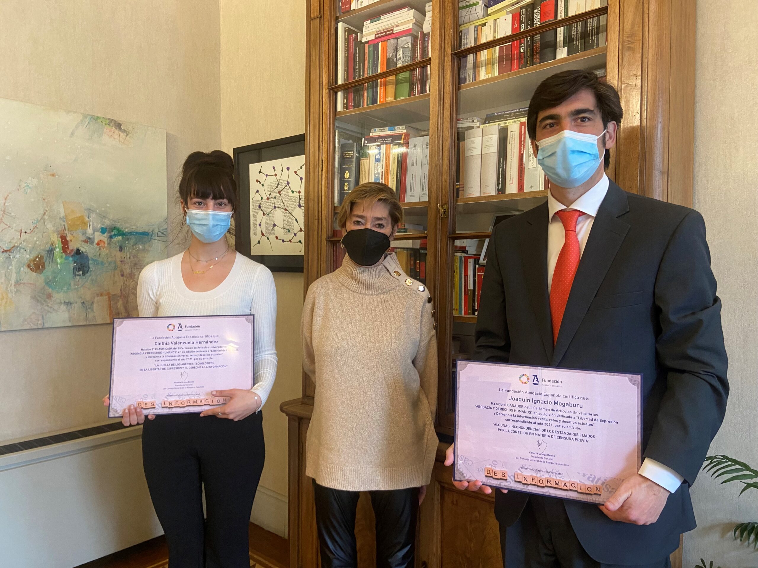La presidenta del Consejo General de la Abogacía, Victoria Ortega, ha hecho entrega a Joaquín Mogaburu y Cinthia Valenzuela de los diplomas que los acreditan como primer y segundo premio, respectivamente, del II Certamen de Artículos Universitarios sobre Abogacía y Derechos Humanos, organizado por la Fundación Abogacía, con motivo de la celebración de su VIII Congreso de Derechos Humanos.