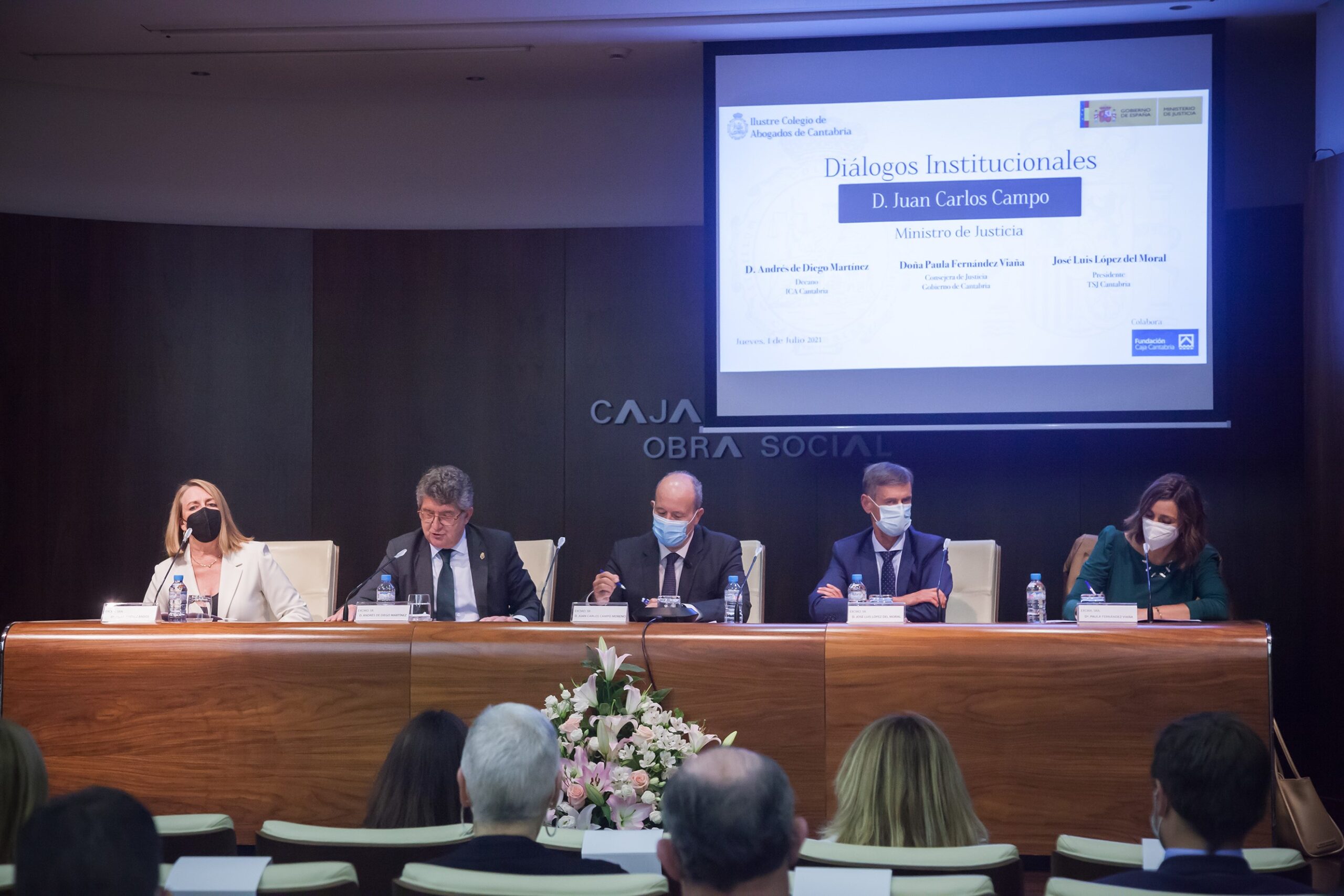 El ministro de Justicia, Juan Carlos Campo, en los Diálogos Institucionales organizados por el Ministerio de Justicia y el Colegio de Abogados de Cantabria, ha destacado el importante proyecto de digitalización que su gabinete está llevando a cabo con la colaboración de todos los agentes que intervienen en la Administración de Justicia, operadores jurídicos y Comunidades Autónomas.