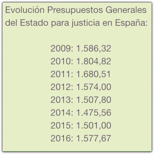 Los presupuestos del Ministerio de Justicia para 2016 contemplan unos gastos de personal que se elevan a 1.303,14 millones de euros, lo que supone un incremento de 85 millones de euros (un 7% más que en 2015). De este incremento, 83,3 millones de euros se destinan a la financiación de las retribuciones del personal de la Administración de Justicia y del Ministerio Fiscal y 1,73 millones para la creación de 25 nuevas plazas de abogados del Estado. El proyecto de PGE presentado por el gobierno también prevé: