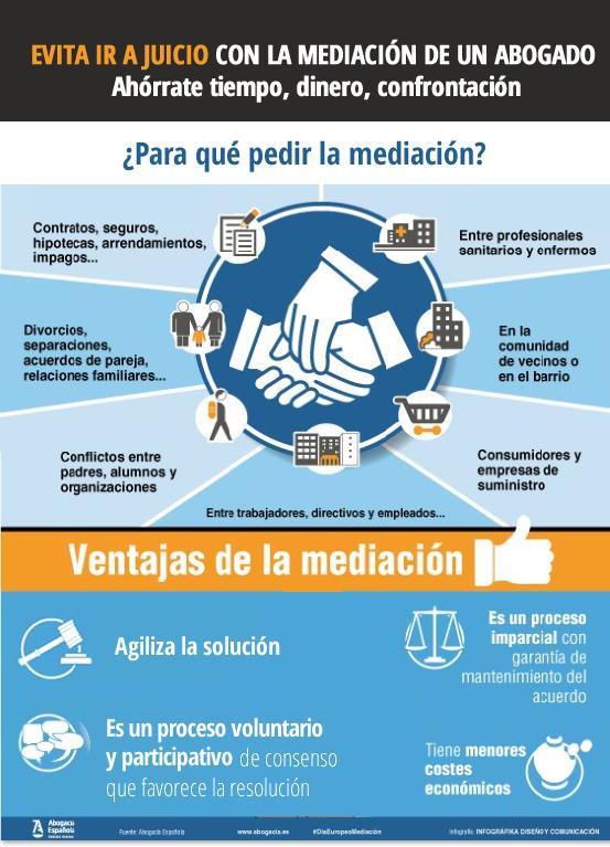 Además, con motivo de la celebración del Día Europeo de la Mediación, la Abogacía Española ha presentado un Manifiesto de la Mediación (pdf) para impulsar esta vía alternativa en la resolución de conflictos. También ha elaborado una infografía destacando las principales ventajas de este sistema autocompositivo de resolución de conflictos.